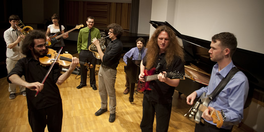 Wooden Cities is both an ensemble and a collective of performers and composers seeking to help increase the performance and awareness of contemporary music in the Western New York area through unique, educational presentations. Formed in July 2011, the group served as a vehicle for director Brendan Fitzgerald to present John Zorn’s game piece Cobra. Since that time the group has grown to include over a dozen performers and is constantly seeking new works by new composers while continuing to present works by some of the essential, yet underrepresented composers of the 20th Century.